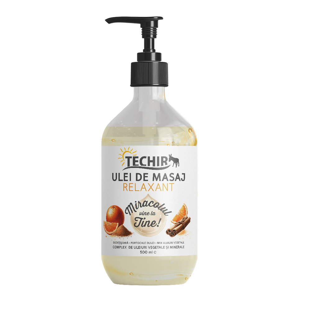Uleiul de masaj relaxant cu scorțișoară și portocale dulci TECHIR combină aromele calde ale scorțișoarei cu prospețimea citricelor pentru o experiență profund relaxantă ce alină tensiunea musculară. Formula bogată în uleiuri de struguri, avocado și ricin, îmbogățită cu vitamina E, hidratează și hrănește pielea în profunzime, oferind suplețe, strălucire naturală și protecție antioxidantă. Cu absorbție rapidă și fără senzație lipicioasă, acest ulei testat dermatologic conține extracte de plante macerate ce conferă proprietăți terapeutice sporite, fiind ideal pentru masaj relaxant și îngrijirea zilnică a pielii.