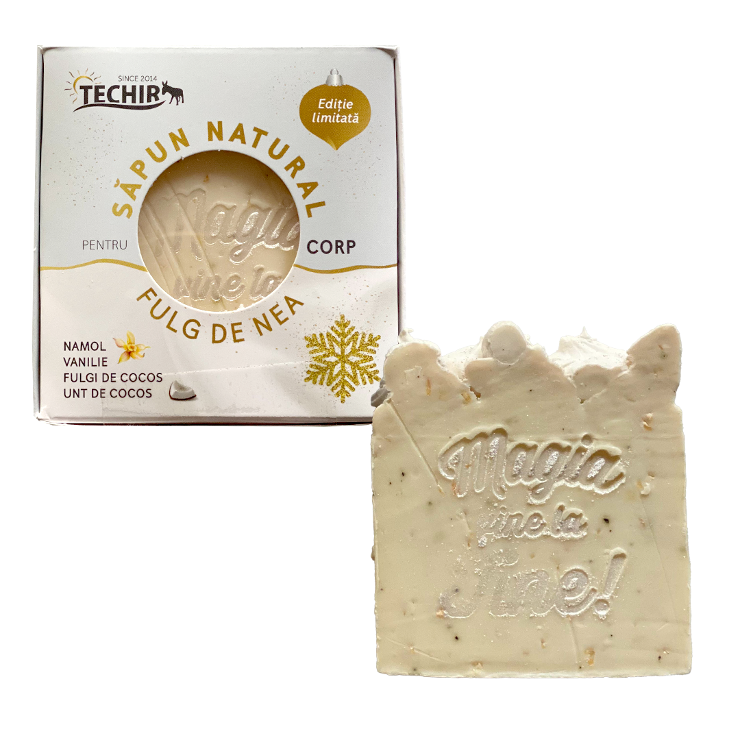 Săpunul natural Fulg de Nea îmbină aroma vaniliei cu prospețimea verbinei pentru protecție și hidratare în sezonul rece. Formula exclusivă conține apă salină și nămol din lacul Techirghiol, unturi vegetale și uleiuri nutritive, iar fulgii de cocos oferă exfoliere blândă. Fabricat manual, acest săpun vegan protejează pielea împotriva deshidratării cauzate de frig și vânt.