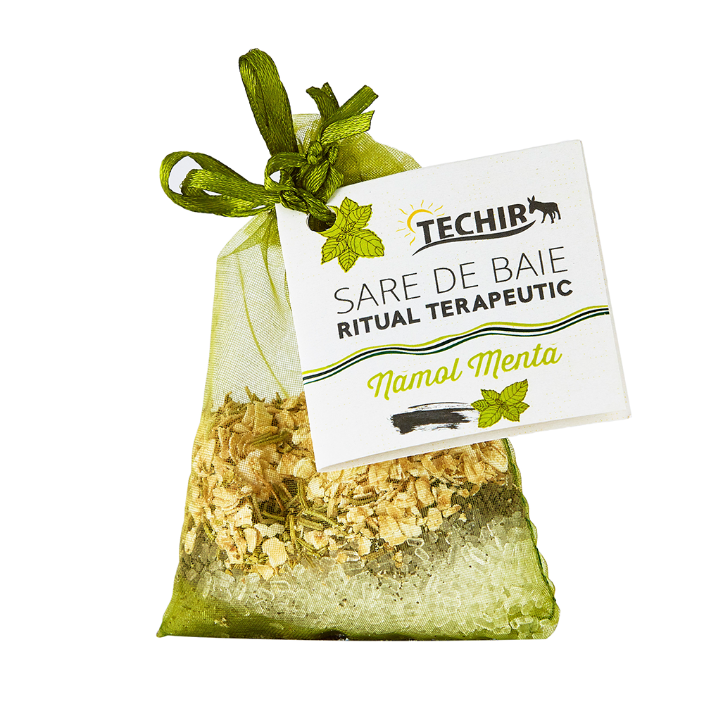 Sarea de baie reconfortantă cu mentă și nămol TECHIR este concepută pentru băi calde săptămânale ce oferă un tratament SPA reconfortant, combinând sarea Epsom cu nămol sapropelic din lacul Techirghiol, fulgi de ovăz, frunze de rozmarin și ulei esențial de mentă. Ambalată într-un săculeț reutilizabil ce se agață sub jetul de apă fierbinte, sarea se dizolvă treptat eliberând substanțe active care sunt absorbite prin porii deschiși de apa caldă, oferind beneficii remineralizante, antioxidante și terapeutice.